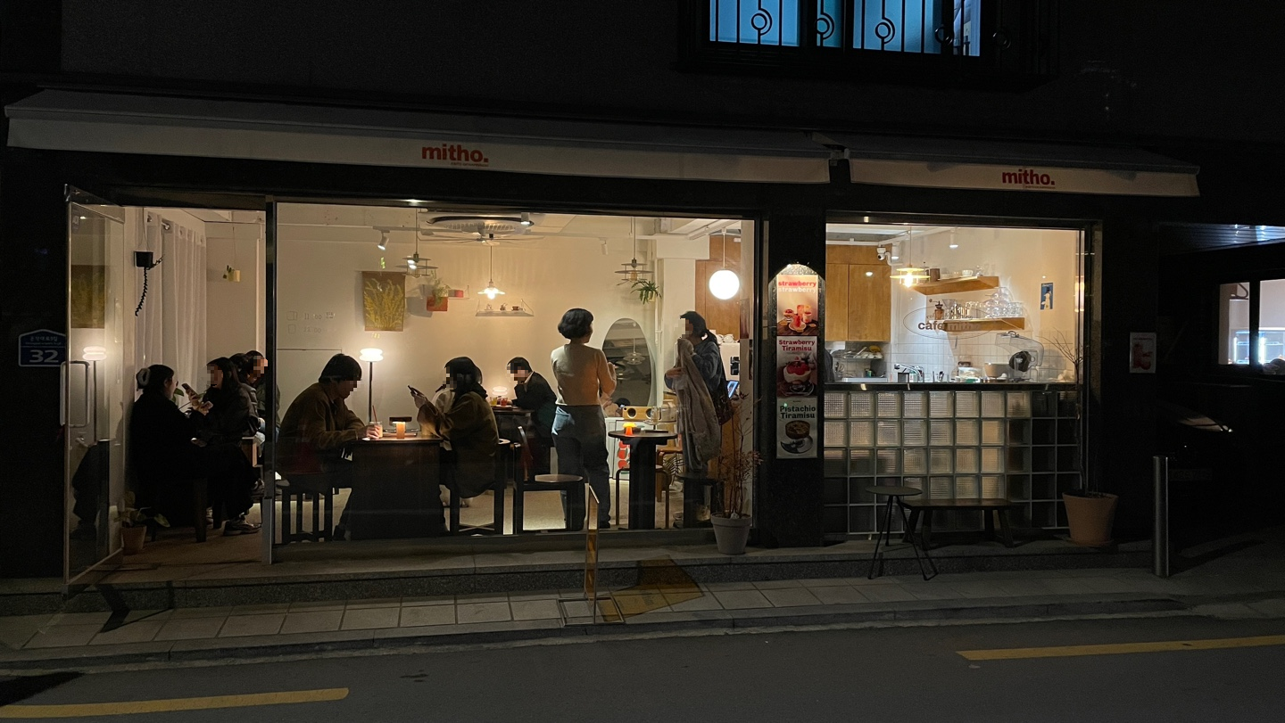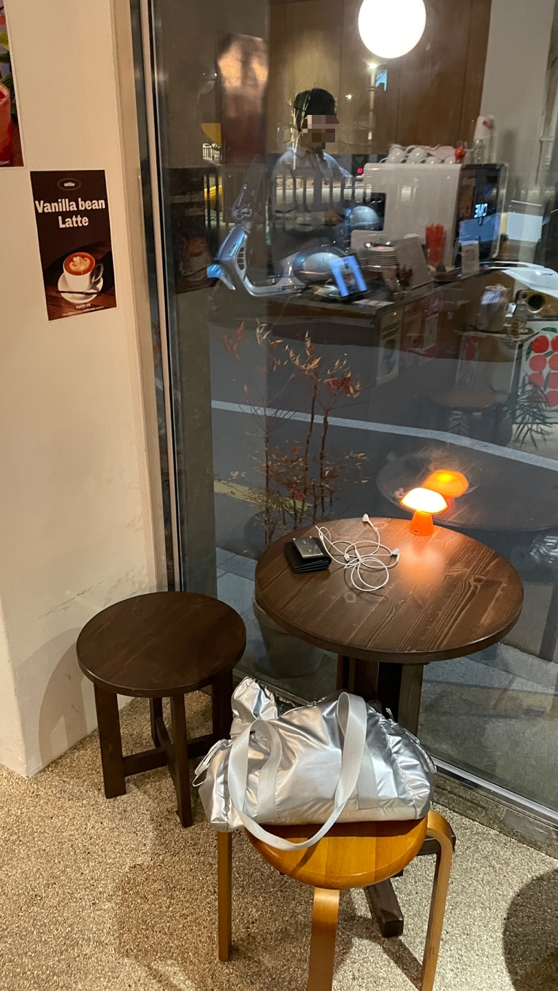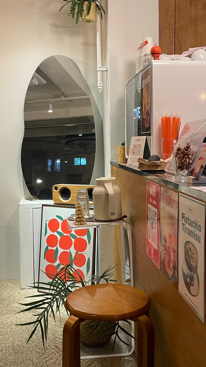 작은 공간을 잘 활용한 느낌이었고, 벽 쪽엔 콘센트 자리가 있어 가볍게 작업할 수도 있겠지만, 낮에 방문해서 여유롭게 커피와 디저트를 먹으며 바깥 구경이나 하고 싶은 분위기였습니다. 혼자 오기 좋은 카페로 추천합니다.