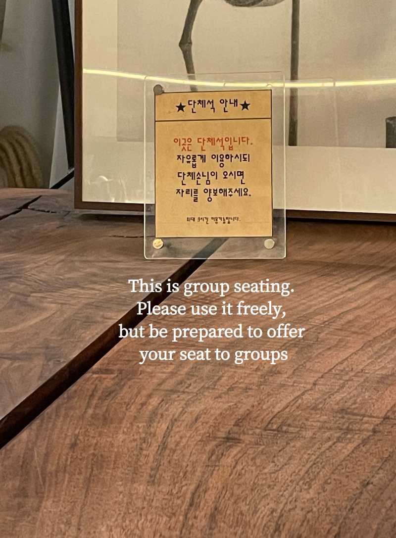 혼자 이용해도 되지만 단체 손님이 우선인 공간 (혼자 방문한 사람들이 여러 명 앉아 있는 경우도 있습니다.)